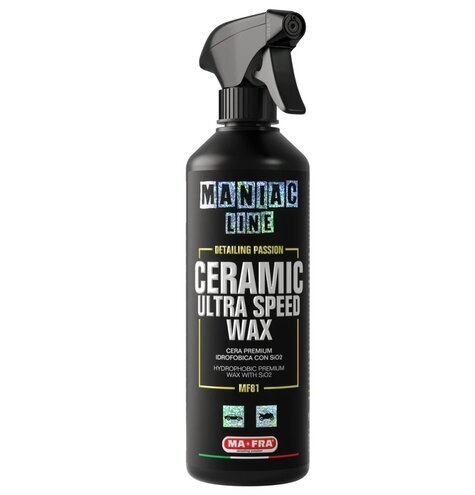 MANIAC Ceramic Ultra Speed Wax - Tesniaci vosk v spreji s obsahom superhydrofóbnych keramických polymérov SiO2, ktoré sa viažu na povrch a vytvárajú samočistiaci ochranný štít. Okamžite sa viaže na lak, odpudzuje nečistoty, vodu a UV lúče a zanecháva vozidlo čistejšie po dlhšiu dobu vďaka svojim neuveriteľným vodoodpudivým vlastnostiam.